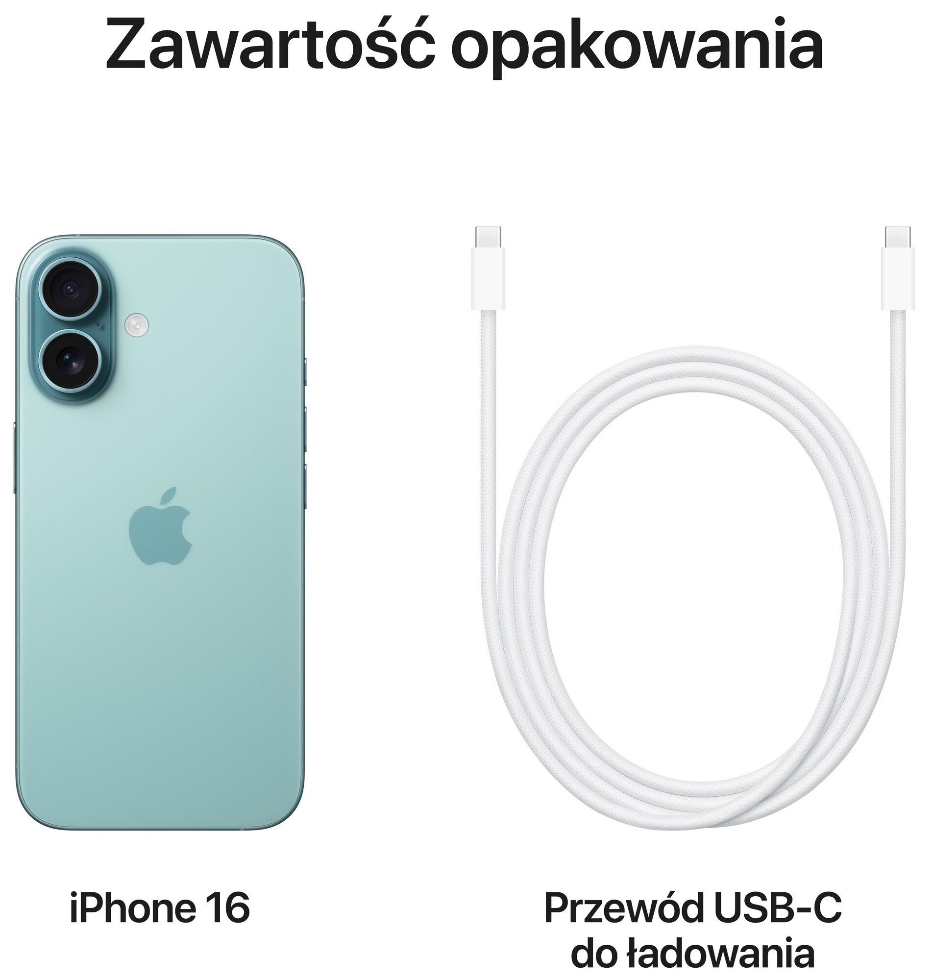 Smartfon iPhone 16, kabel USB-C/USB-C i dokumentacja.